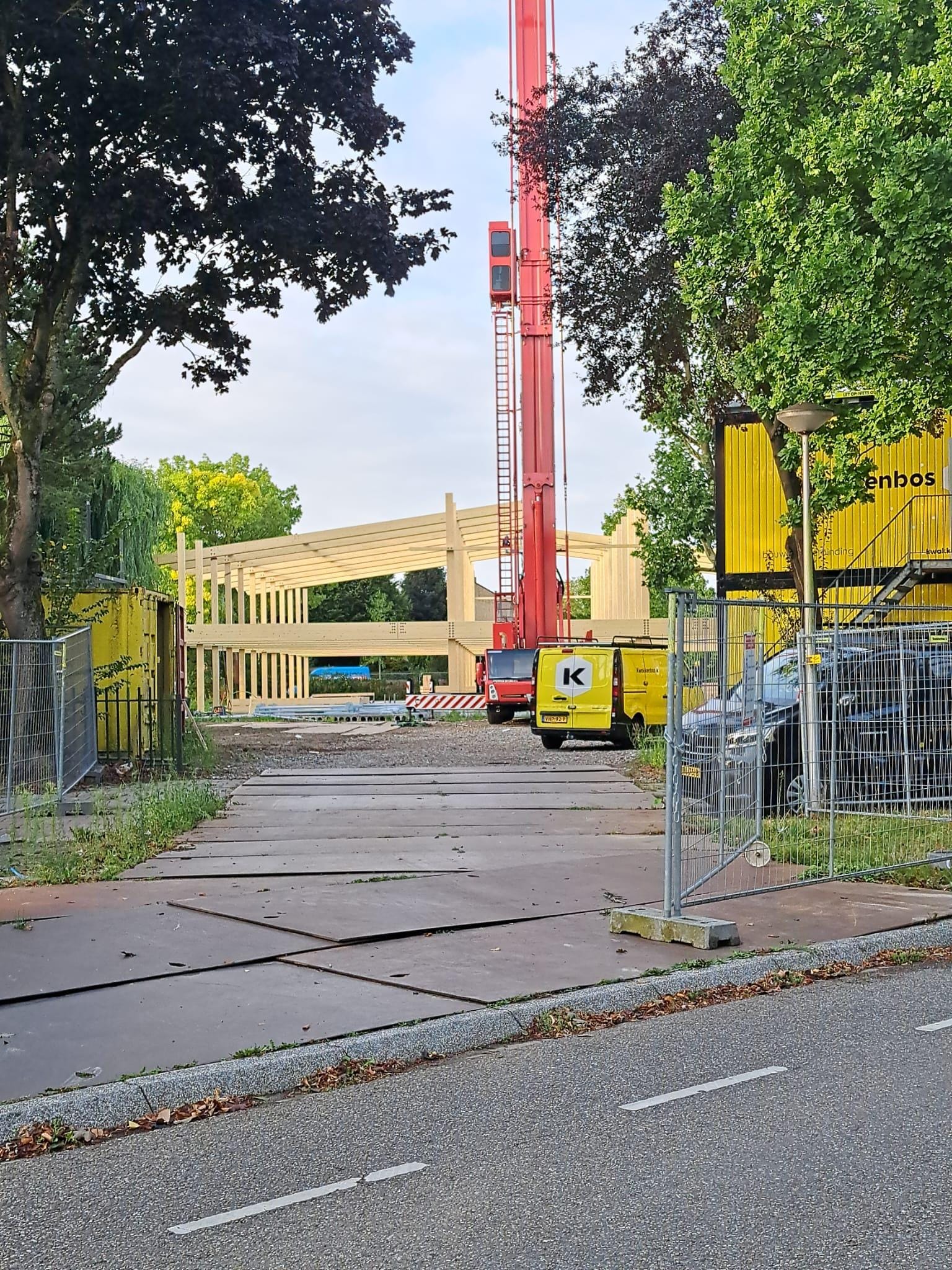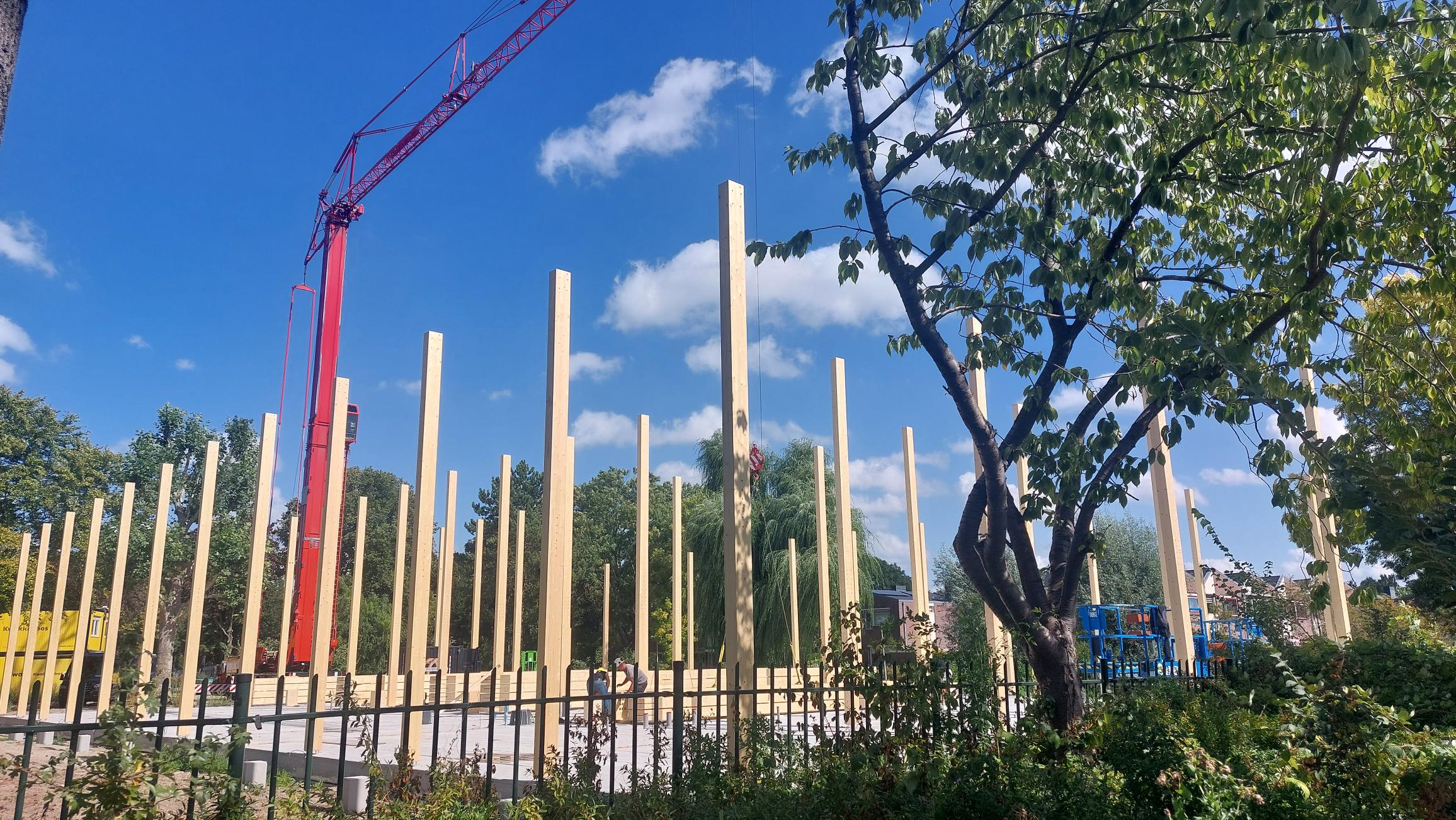 Deze week gingen de palen de lucht in. Je kunt nu heel mooi zien hoe het houten geraamte van het pand vorm krijgt.
